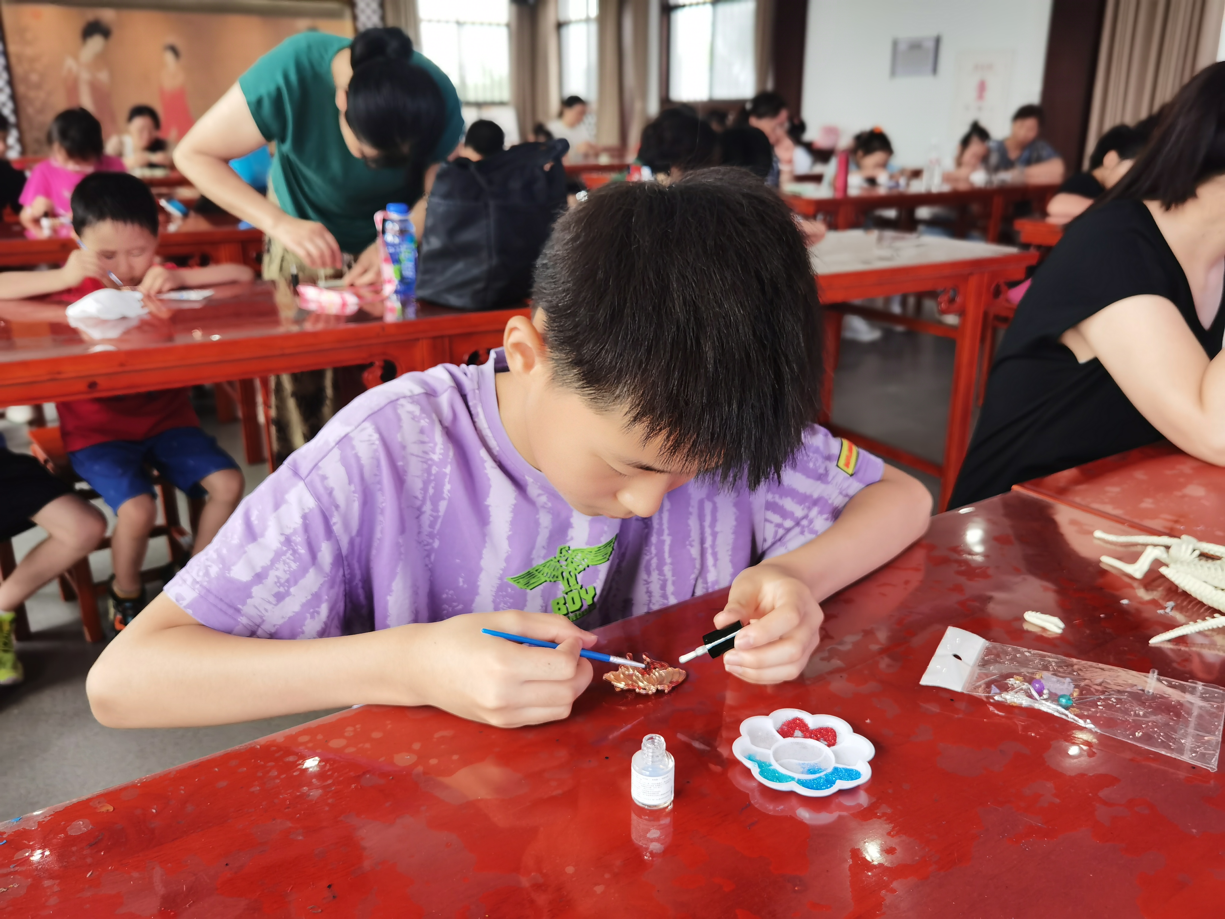 活动中,广储社区以家庭为单位,亲身感受仿烧蓝发簪制作以及模拟考古的乐趣。发簪,作为我国传统饰品的杰出代表,是汉文化传承的重要载体,承载着悠悠古韵的独特魅力。首先工作人员向居民们详细介绍了中国传统非遗工艺文化“景泰蓝”的源远流长、技艺演进与深邃内涵,使他们对传统工艺的认知得以深化,深刻领略传统非遗之美。仿烧蓝的中式发簪,仅以红绿蓝三色呈现,红、绿、蓝乃是色彩领域不可再分解的三种本原之色。这三种颜色恰是基层党建的“三原色”,亦是我们基层党员的本真底色。“红”象征着热血之红、信仰之红,是我们对党和国家的忠贞不渝与炽热热爱;“绿”寓意着绿水青山、自然之绿,是我们对生态环境的珍视与呵护;“蓝”代表着活力之蓝,寓意着创新与发展,激励着我们精心绘制上下一心的宏伟“蓝图”。在工作人员的指导下,众人通过亲身实践,依循制作流程,调色、点蘸、上色,凭借一双双灵巧之手体悟彩砂与金属的交融之美,在感受美、欣赏美、创造美的过程中品味古风雅韵,更精心勾勒出当代绚丽多彩、丰富美好的精神文化生活画卷。