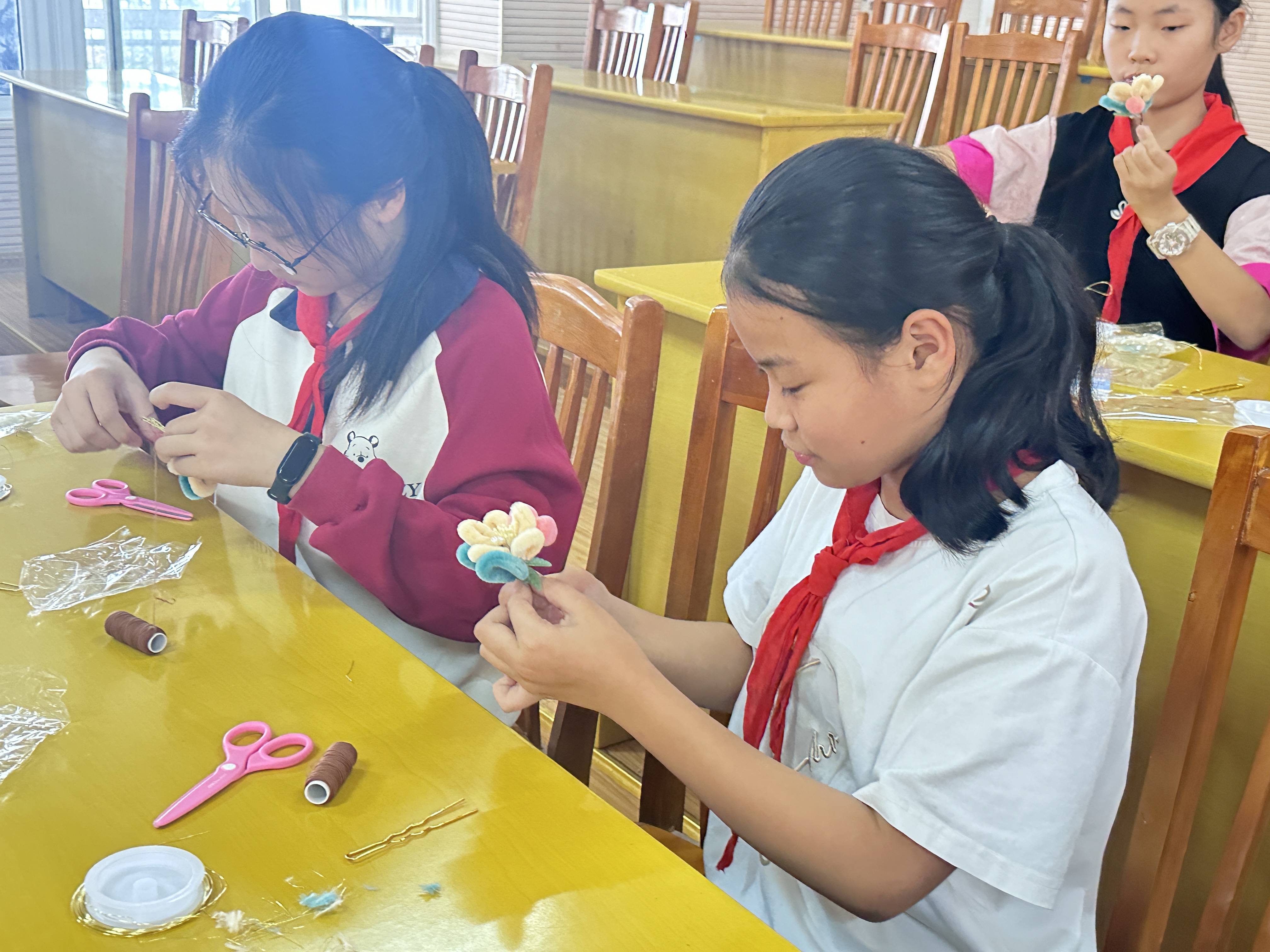 绒花作为一种传统非遗手工艺品,以其色彩鲜艳、造型逼真而著称。在制作过程中,孩子们学会了如何运用各种工具将彩色丝绒塑造成形态各异的花朵。他们发挥想象力,创作出了一朵朵美丽的绒花,仿佛为校园增添了一抹亮丽的色彩。