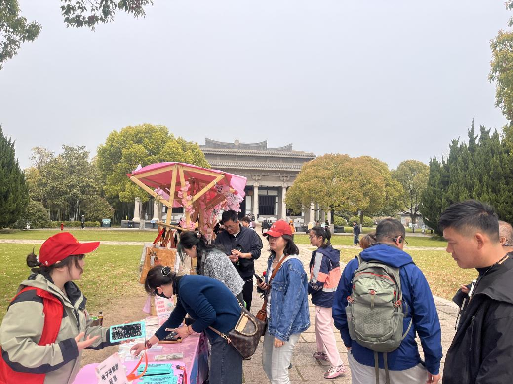 出馆蓦然回首,一树四色洒金碧桃正灼灼其华。粉若胭脂、白似霜雪、赤如焰火、洒金流霞,万千花瓣随风轻旋,恰似《簪花仕女图》飘落的绮丽梦境。