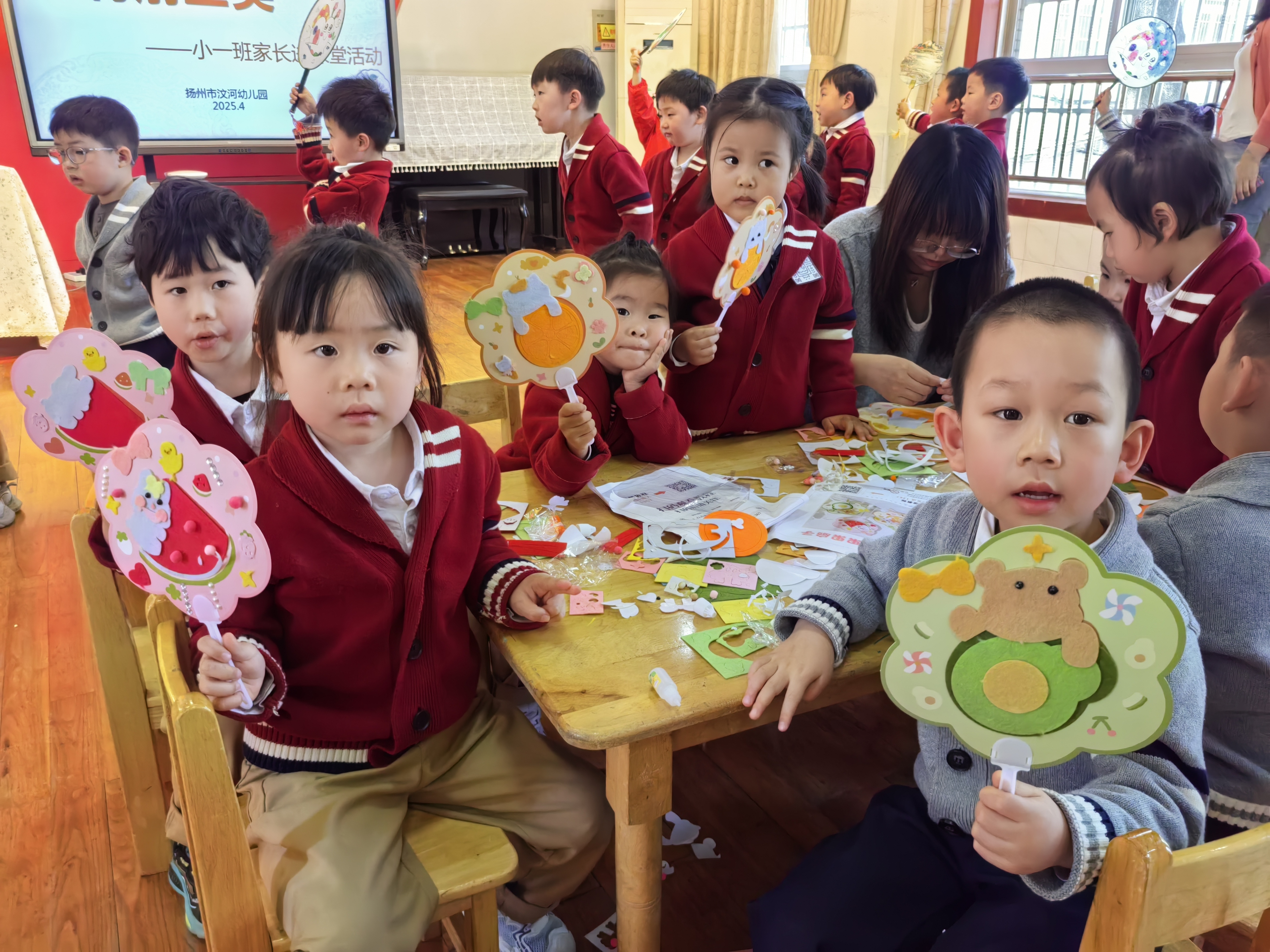 水果卡通粘扇区也很热闹,孩子们精心挑选图案,粘贴在扇面上,可爱的水果与扇子相得益彰,仿佛将接下来的夏天清凉“锁”在了扇间。