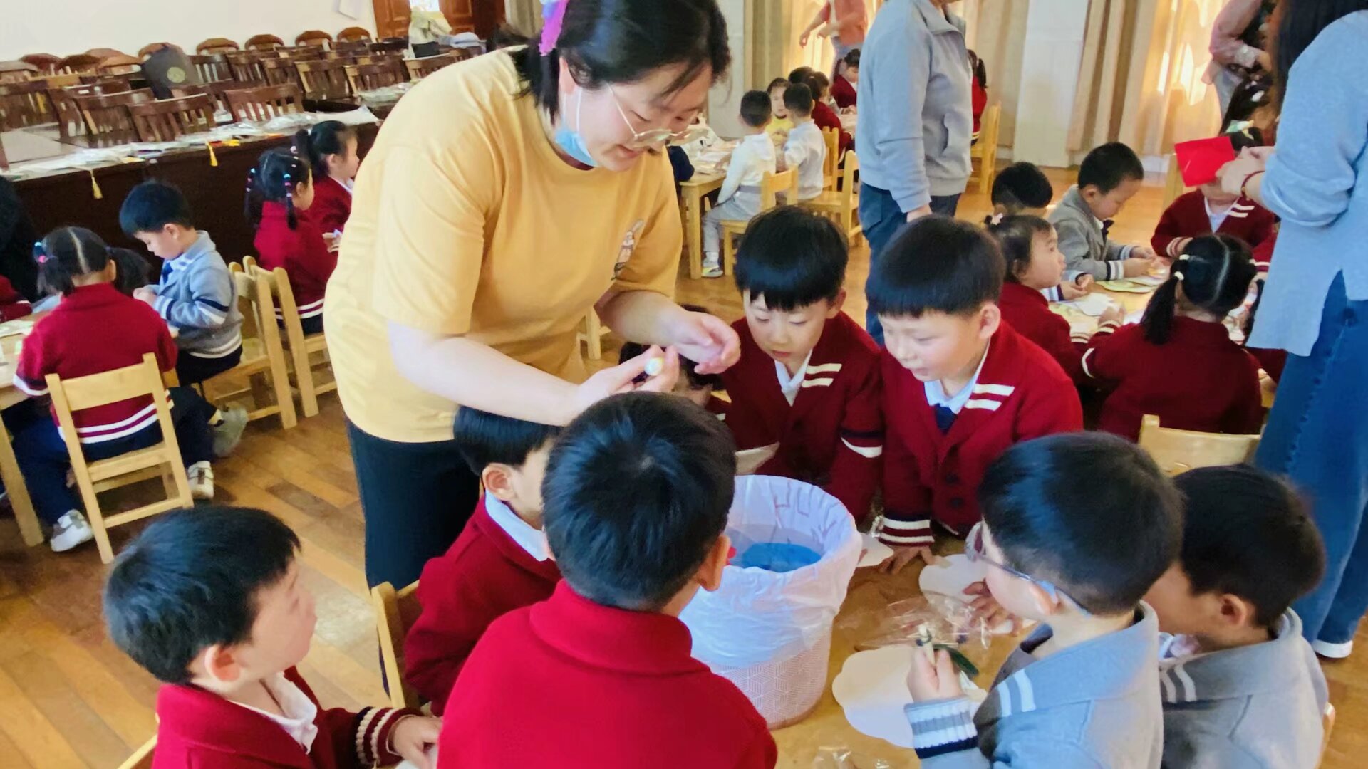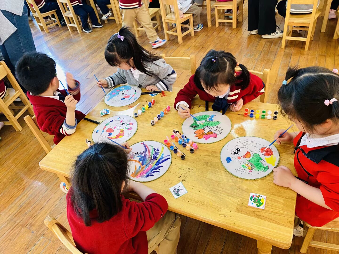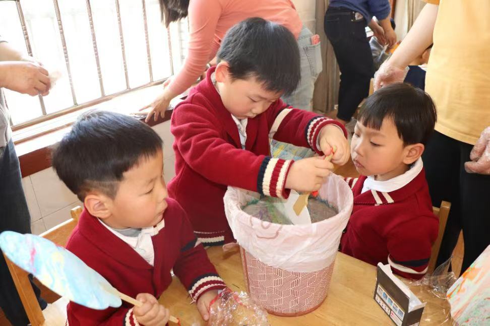 绘画区更是五彩斑斓,孩子们拿起画笔,在扇面上画出嫩绿草地、绽放花朵、飞翔小鸟,每一笔都透着对春天的喜爱。