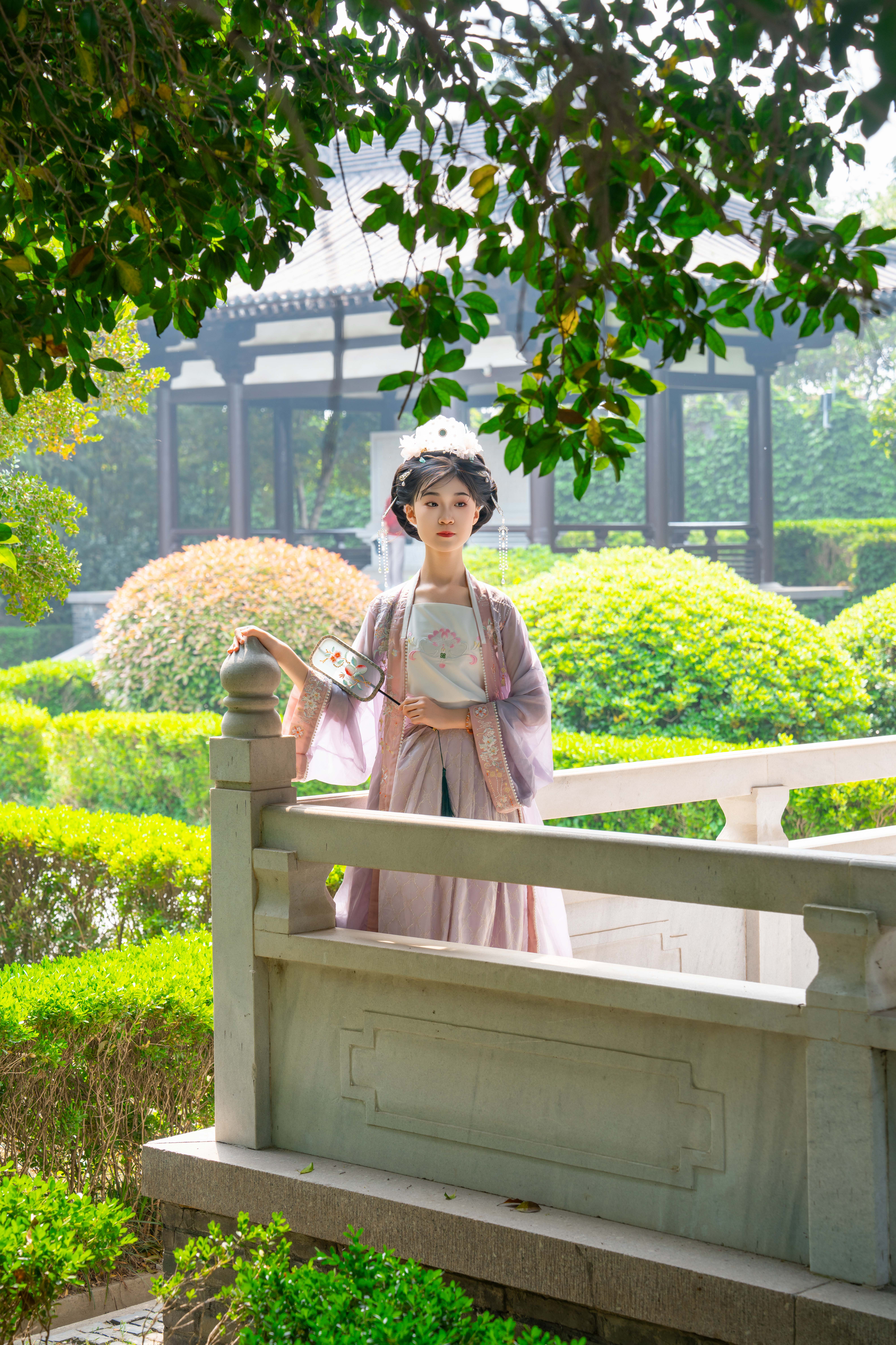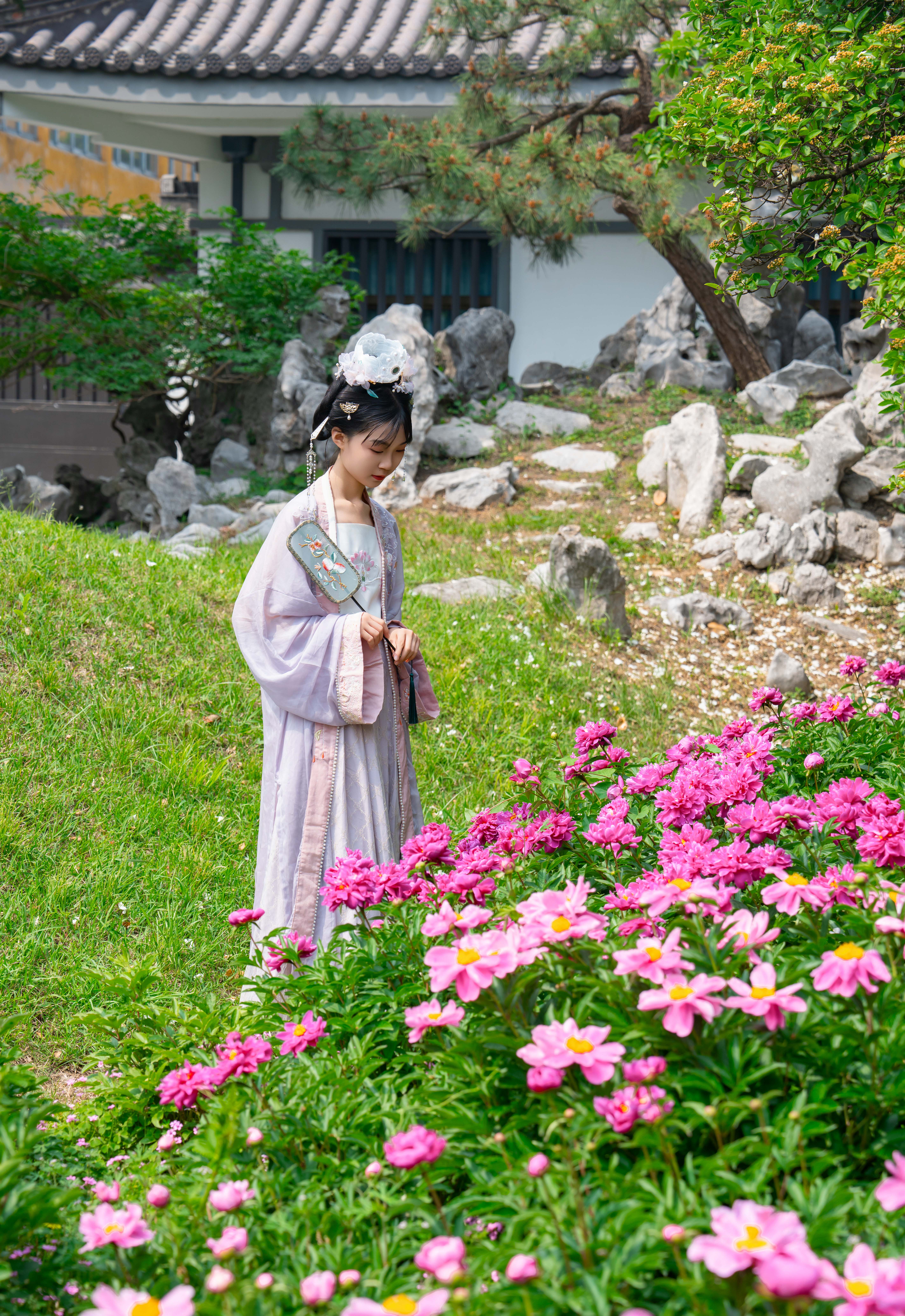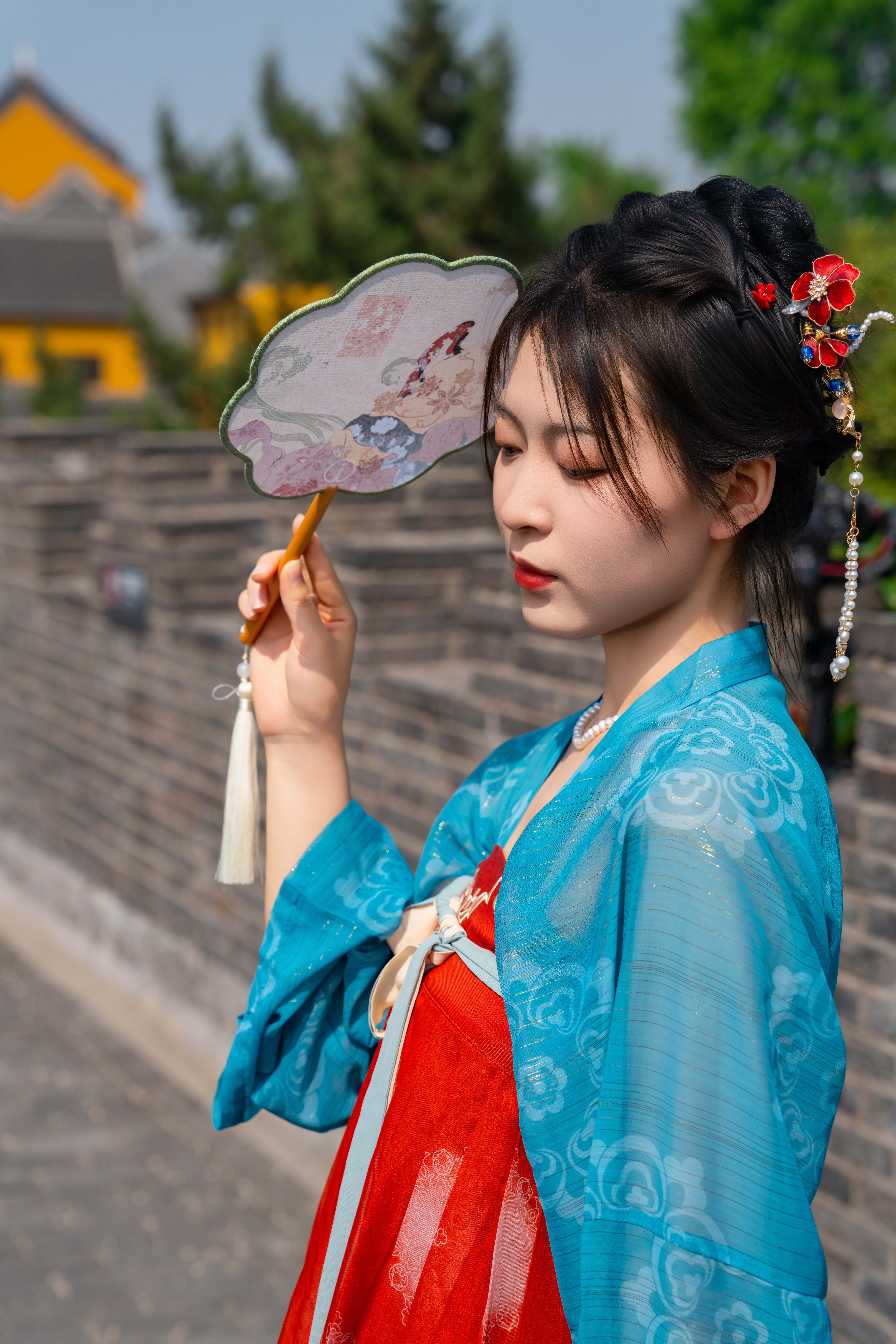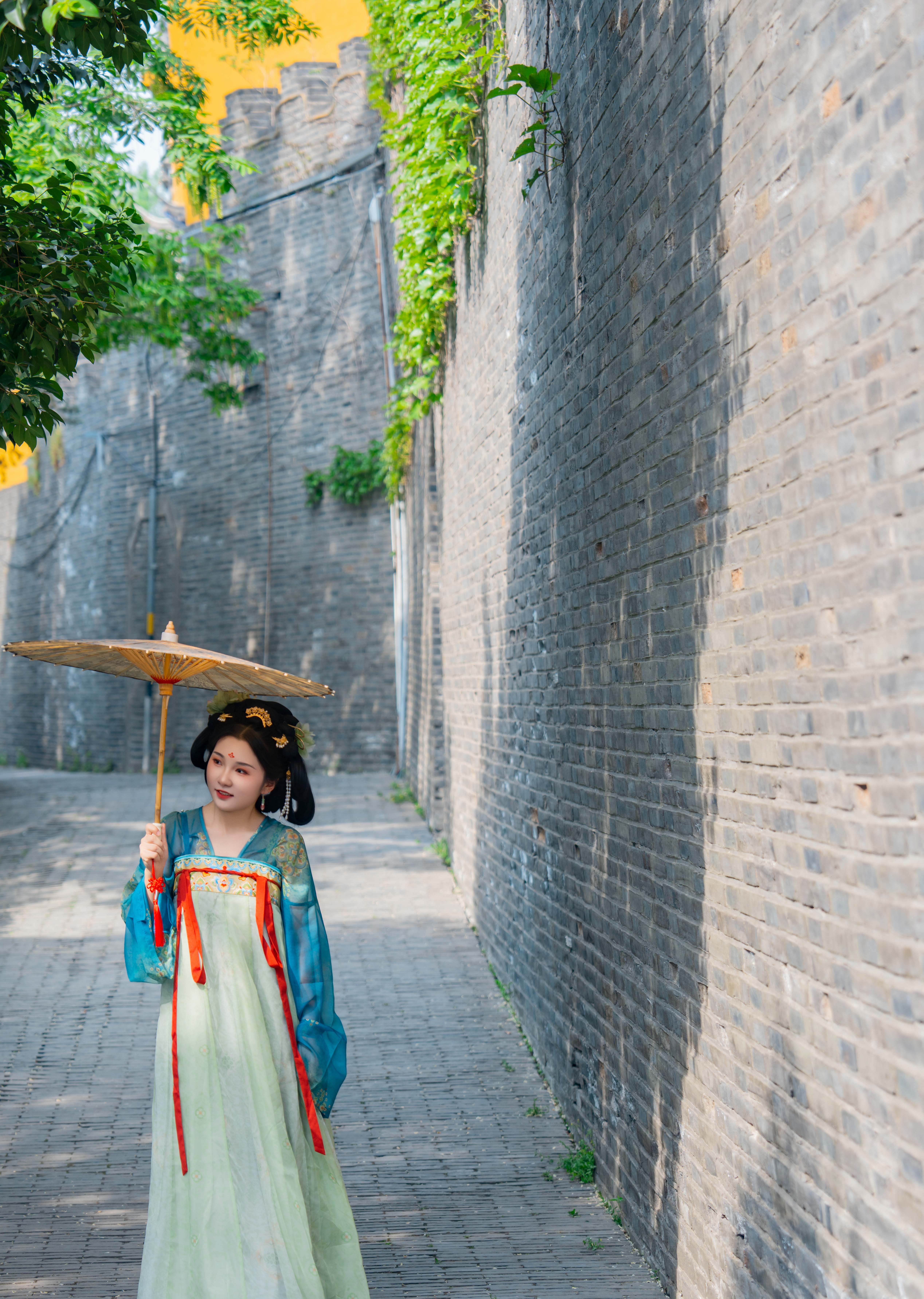 仿唐式楼阁间,芍药吐艳,牡丹倾国,层层叠叠的花瓣如云霞坠地,将千年风雅泼洒成满地锦绣。青石城墙上,苍翠的爬山虎织就时光的经纬,垂落飞檐,与美人逶迤的裙裾缱绻相缠。