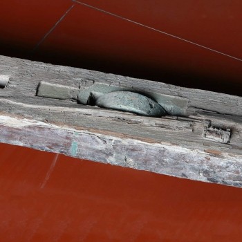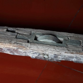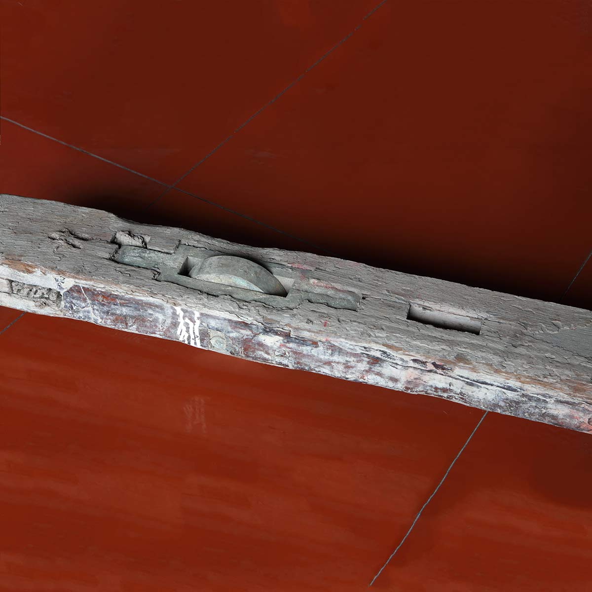 木上镶嵌有3个铜轮,为推动棺柩使用的物件,铜轮上刷有褐色油漆,铜轴一边为方头,一边为圆头,保存较好。