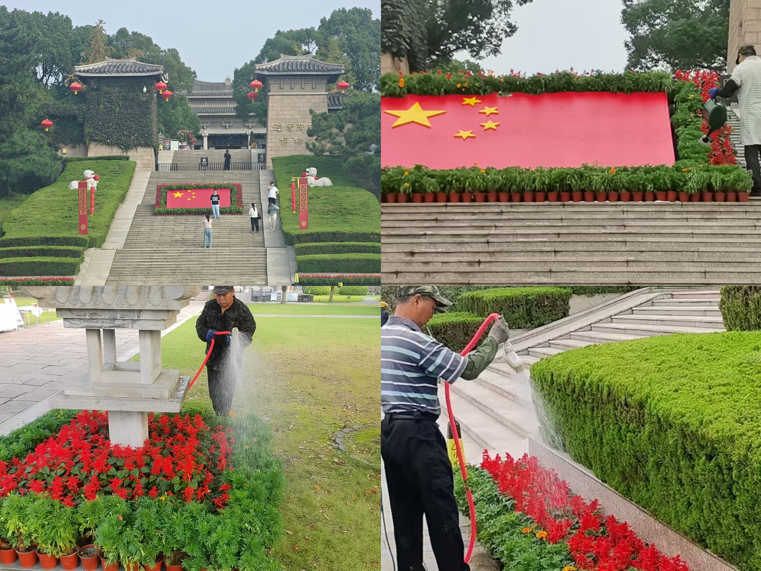 除通过红旗灯笼摆件、主题花卉景观等布置形式营造浓厚的节庆氛围外,对沿路花箱更新的花卉和修剪完好的绿植草坪在开、闭园前后时段及时浇灌补水,确保景区内花卉的鲜艳、植被的健康生长和良好形态,保持舒适宜人的景观效果。