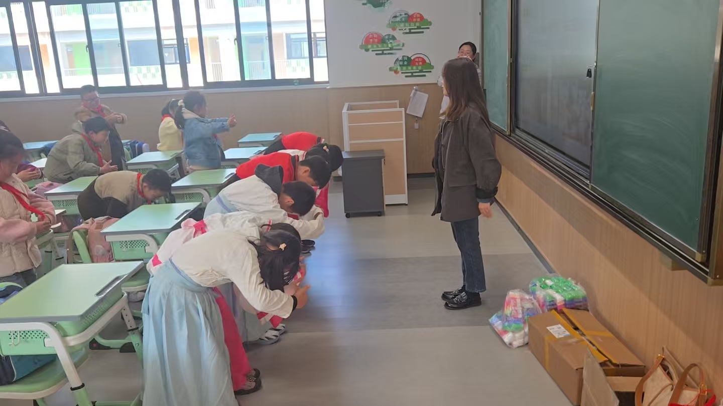 “拱手礼要手心相对,高不过眉,体现的是华夏礼仪的谦逊之美。”课堂上,文化使者身着典雅汉服,细致讲解汉服的形制特点与文化寓意,手把手教孩子们行拱手礼、揖礼。孩子们挺直腰背、模仿践行,一招一式间尽显对传统礼仪的敬畏与喜爱,课堂瞬间变身“古风学堂”。