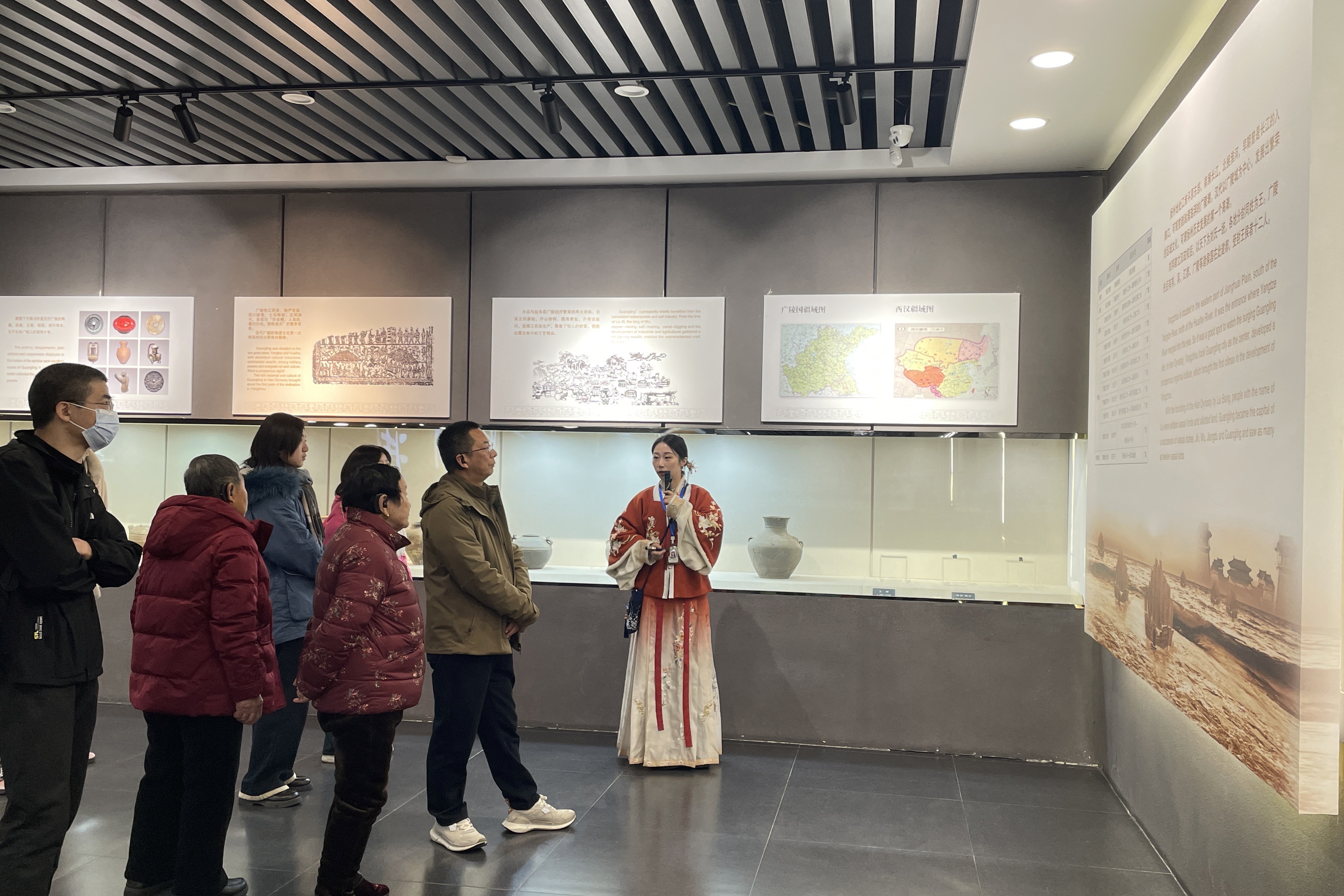 春节期间,她们全程带队讲解,细说广陵王刘胥生平,以通俗语言拆解汉代最高葬制黄肠题凑——856块楠木凭榫卯拼接,无钉无铁,堪称古代木构巅峰。同时讲解“黄肠”“题凑”含义与汉代丧葬观念,穿插趣味历史知识,让考古学问变得生动易懂,大人孩子都能读懂其中匠心,感受汉代文明底蕴。