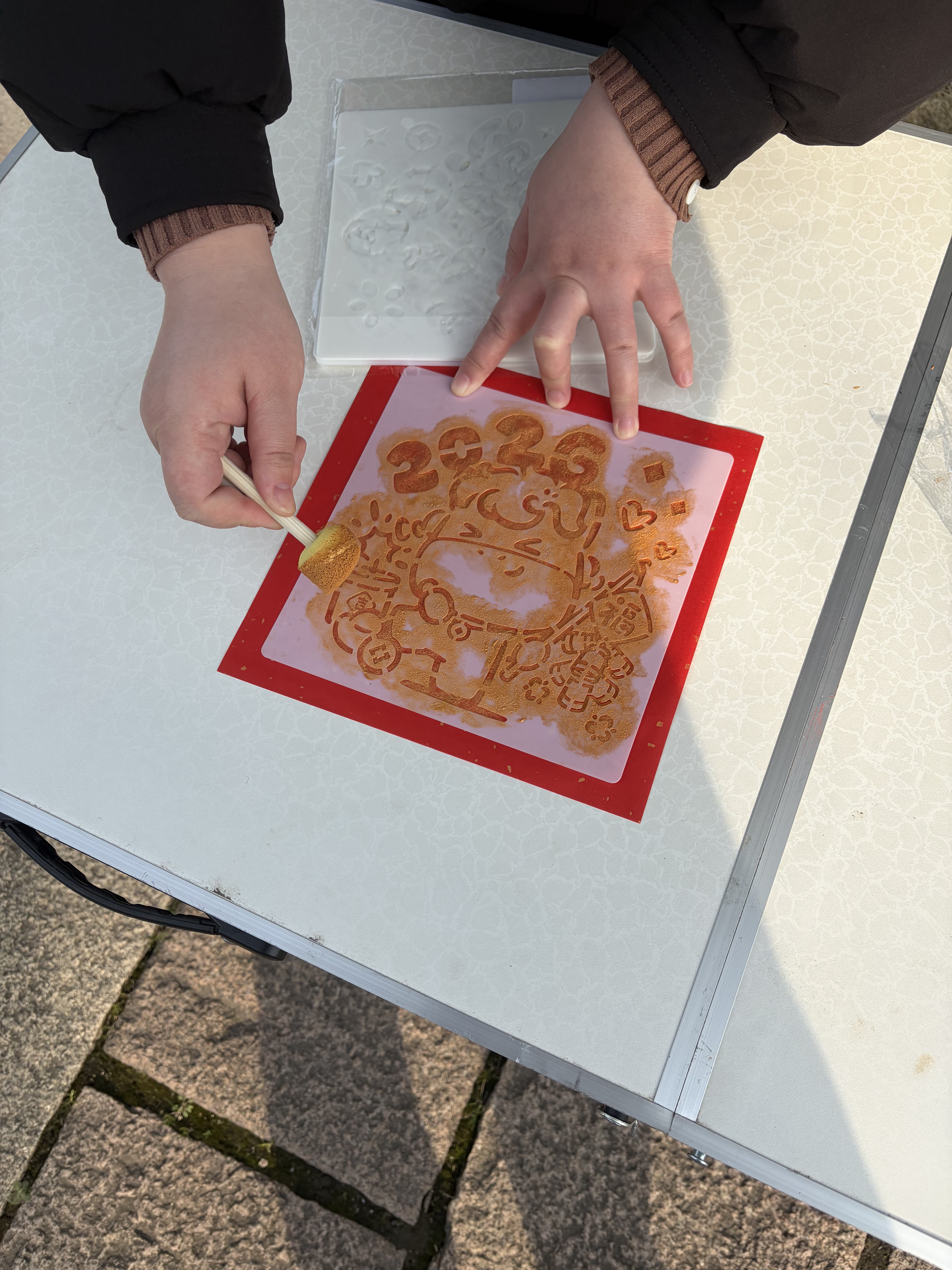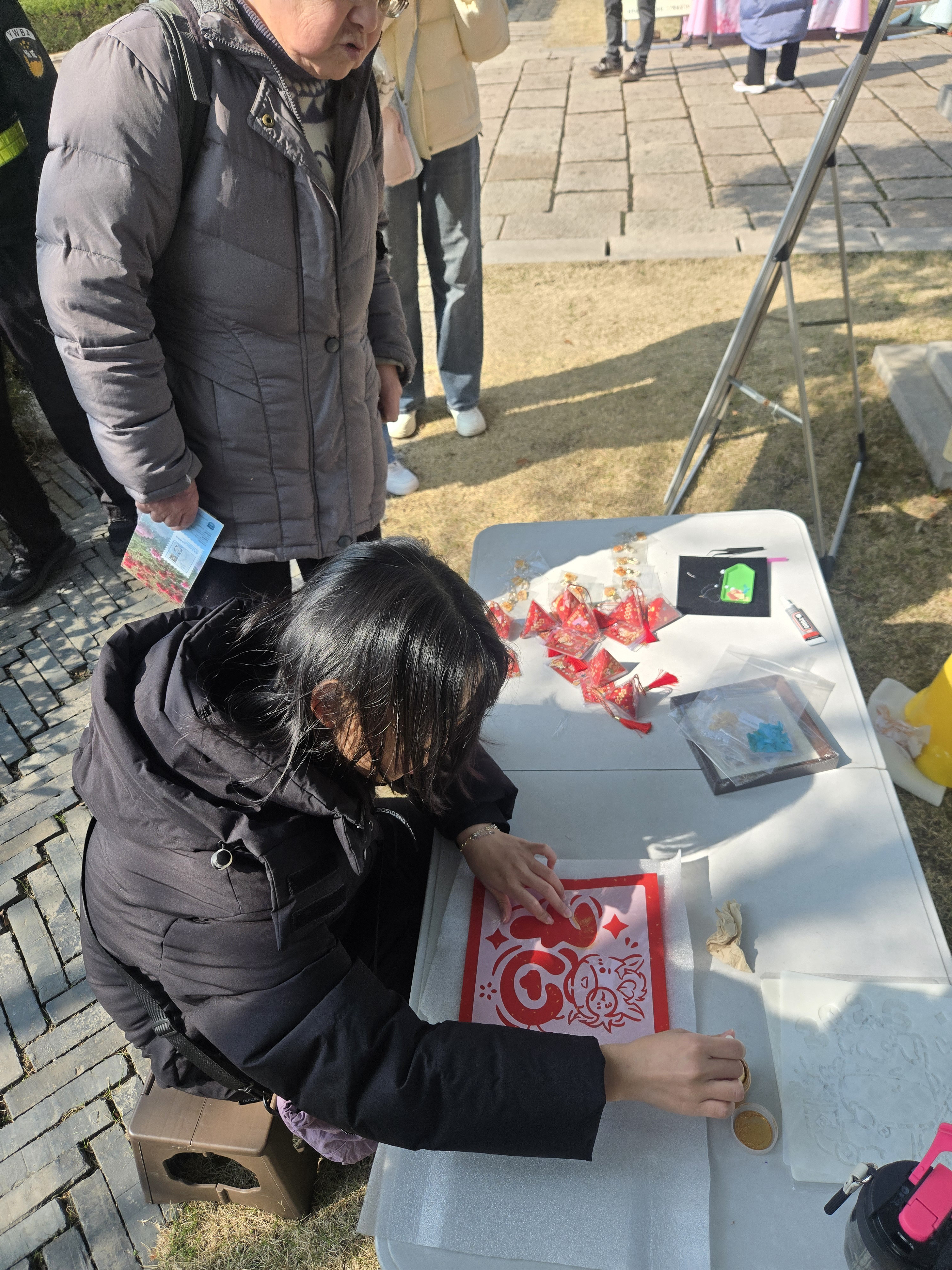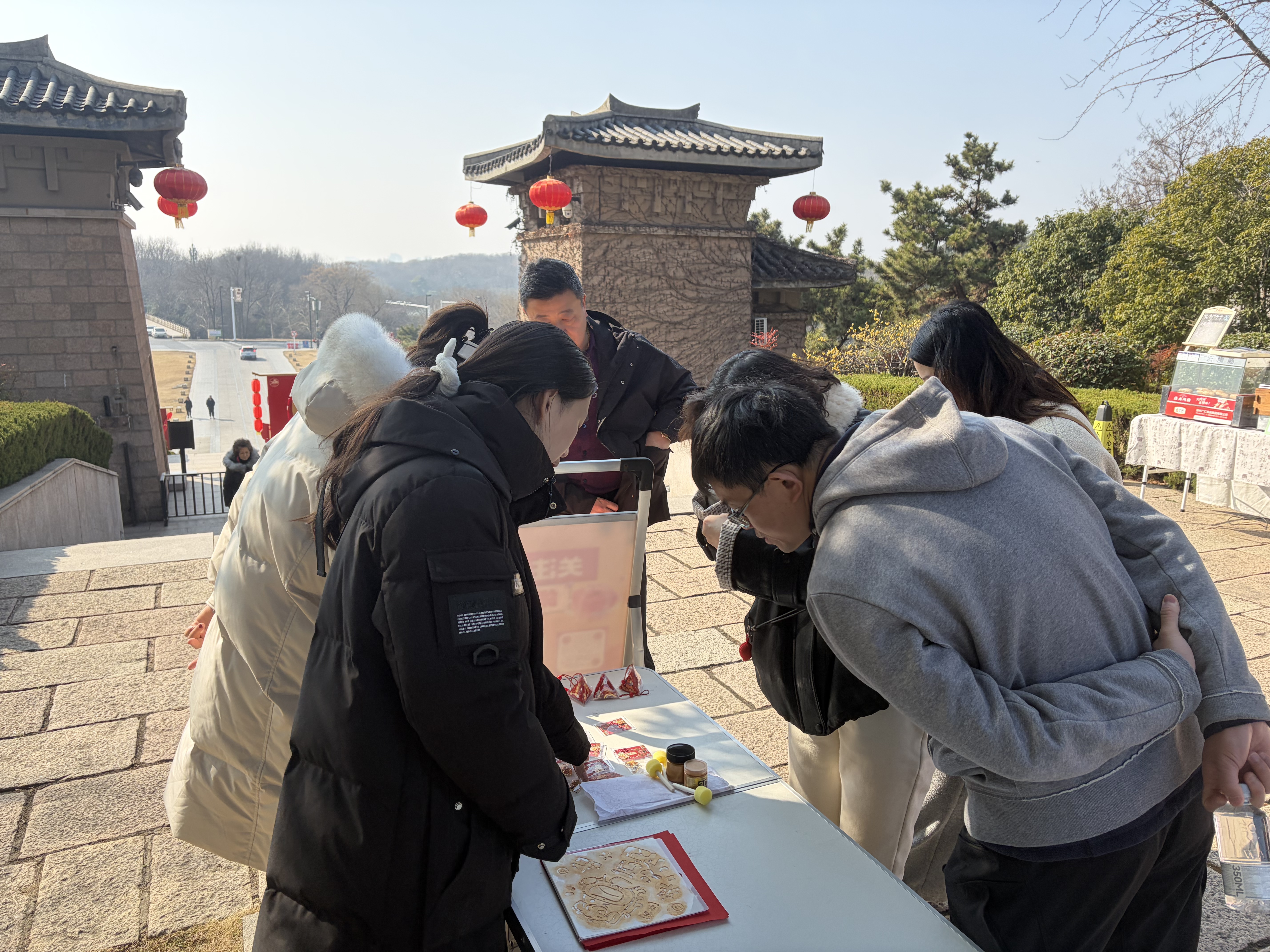 活动期间,景区非遗体验区热闹非凡。福字拓印摊位前,游客们络绎不绝,在景区工作人员的指导下,亲手体验拓印的魅力。大家手持工具,蘸墨、上纸、拓印,一张张带着吉祥好运元素的作品新鲜出炉,承载着满满的新春祝福。