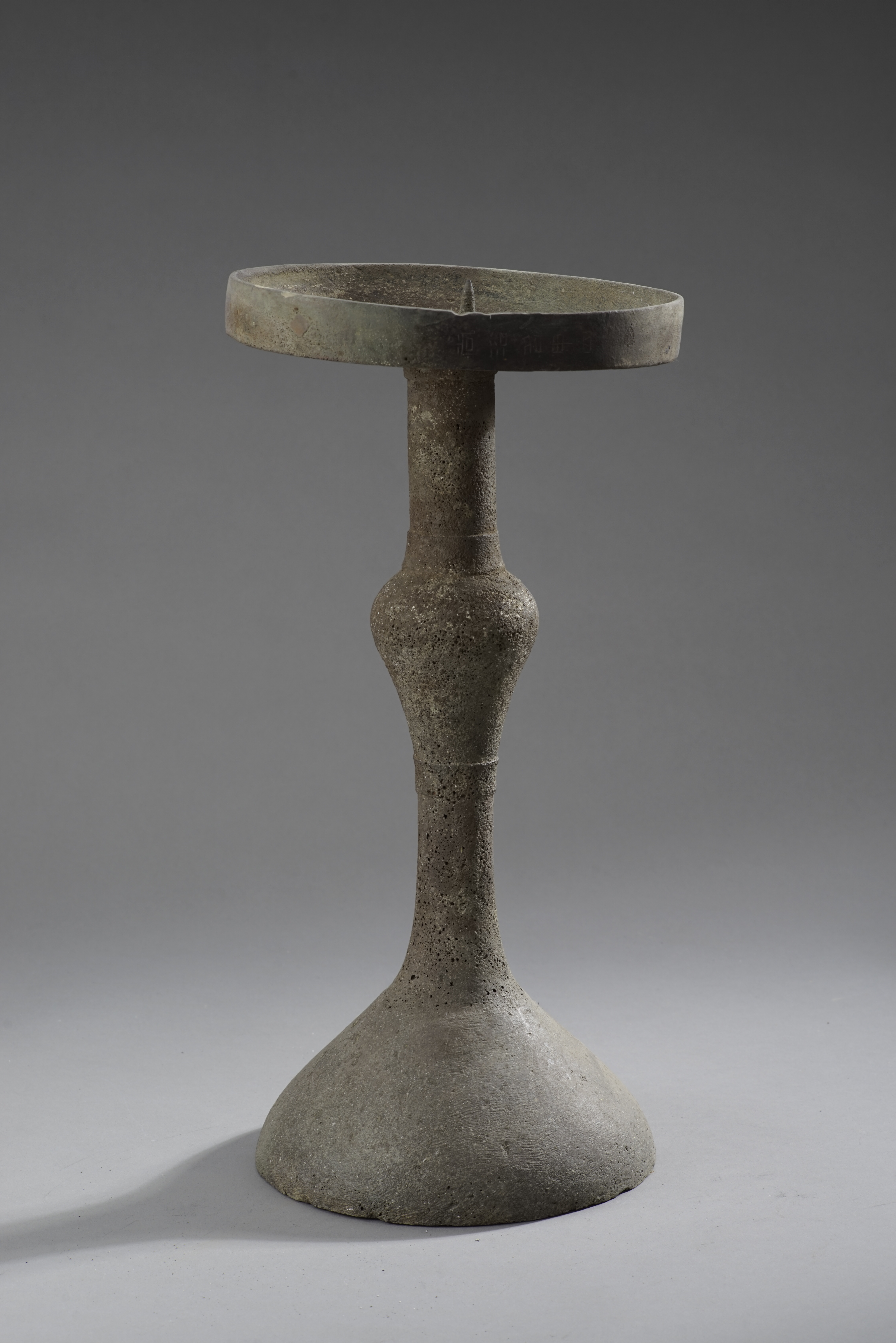 此铜灯通高39.5厘米,底径18厘米,盘径19厘米。整体为青铜铸造,环形足沉稳端庄,灯体作蒜头形,中间饱满、两头收窄,柱身饰两道旋纹,简约流畅,尽显汉代青铜工艺的典雅之美。灯盘深2.5厘米,中心设有锥形铜烛芯,用以固定烛火,灯盘外侧清晰篆刻“尚浴名甲四”铭文,为我们揭开了它的独特身份。