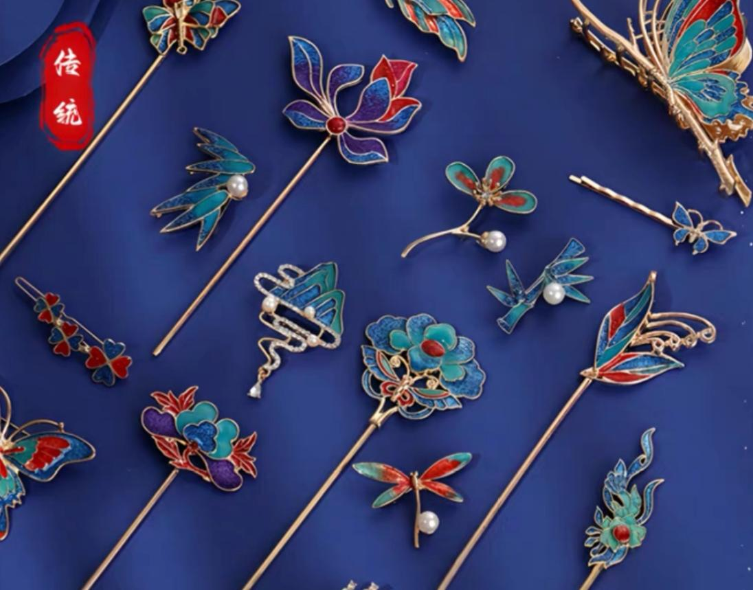 指尖点蓝,簪挽青丝,感受传统金属工艺的流光溢彩。匠心点翠,古韵天成。