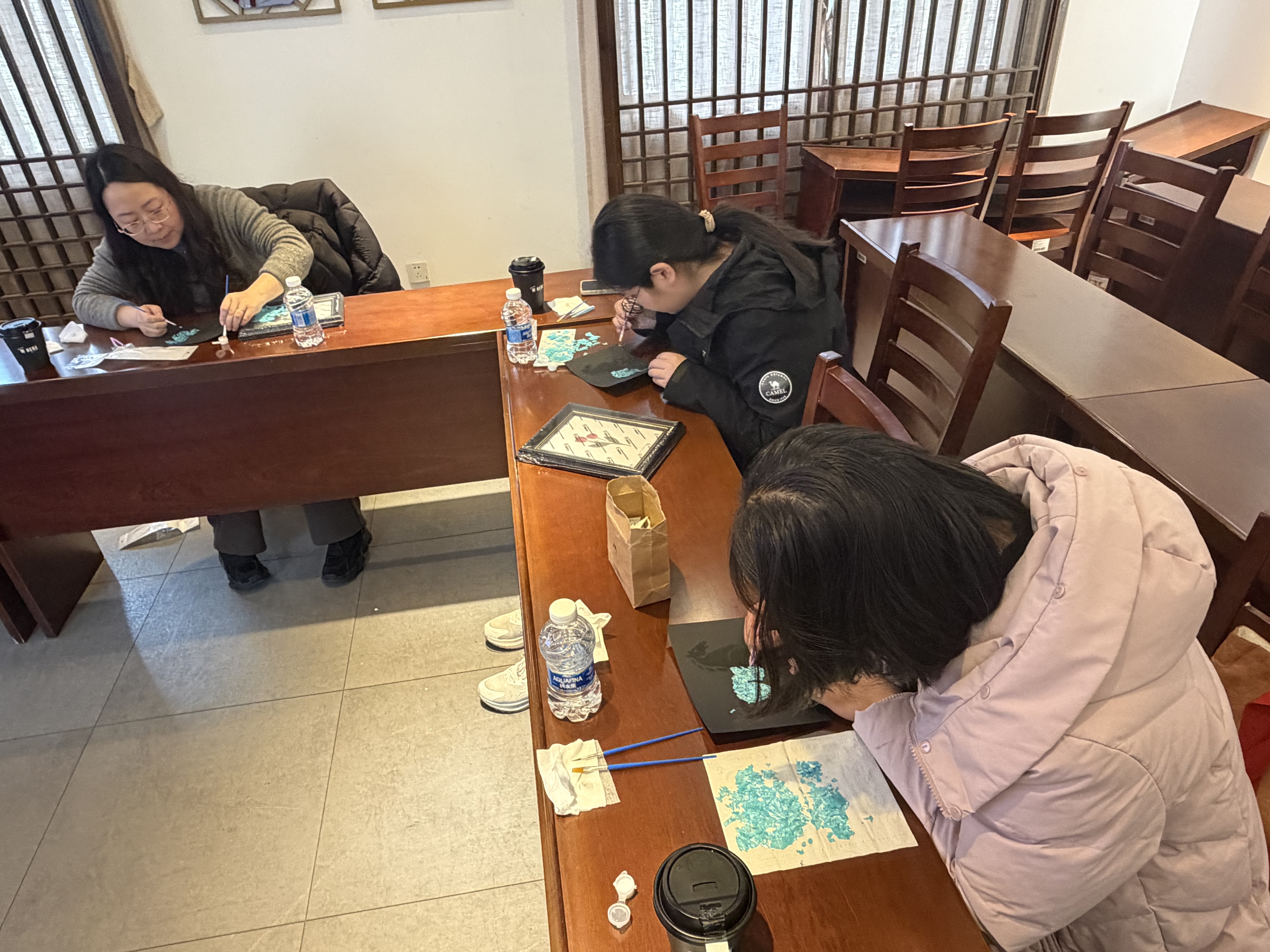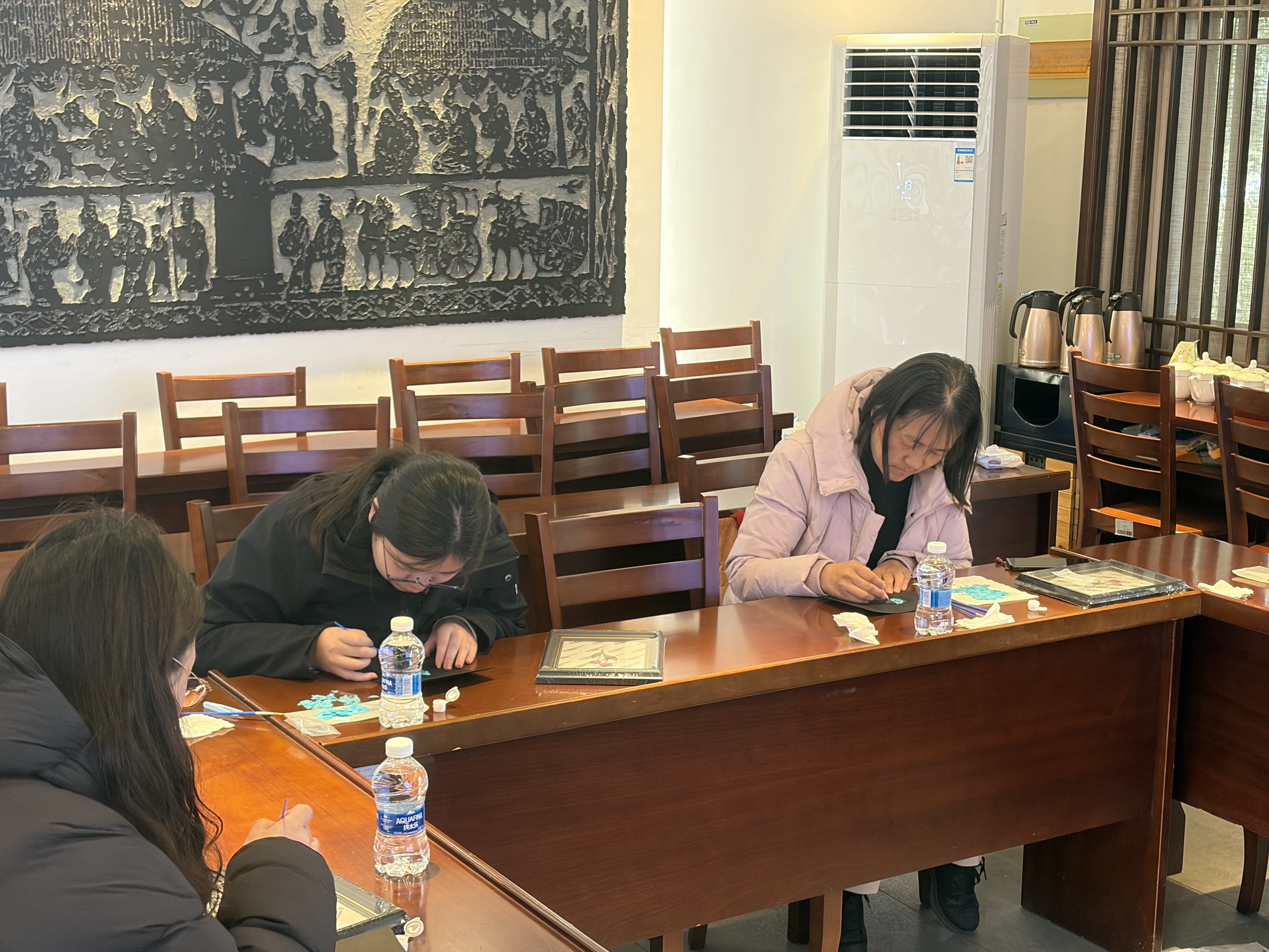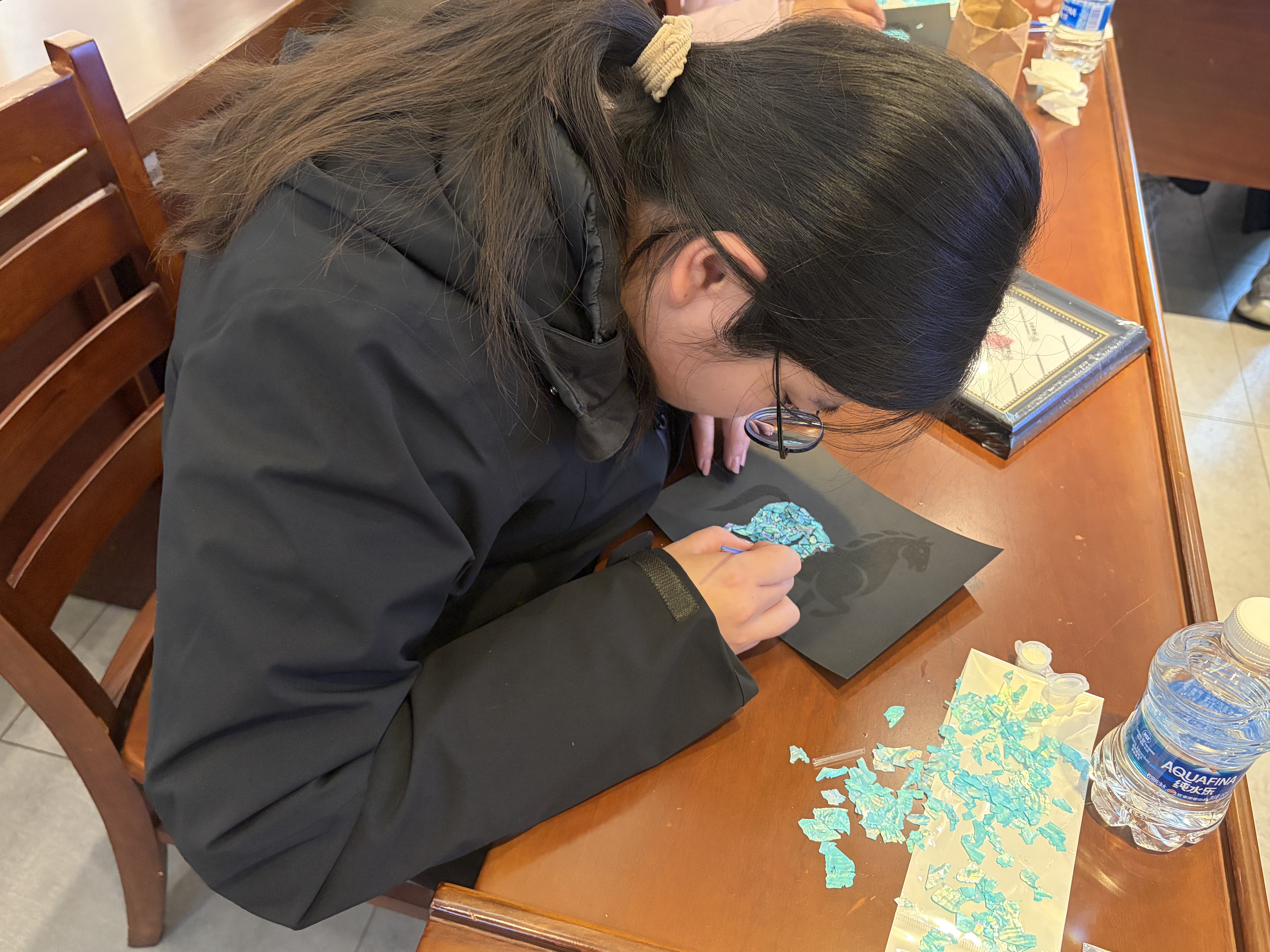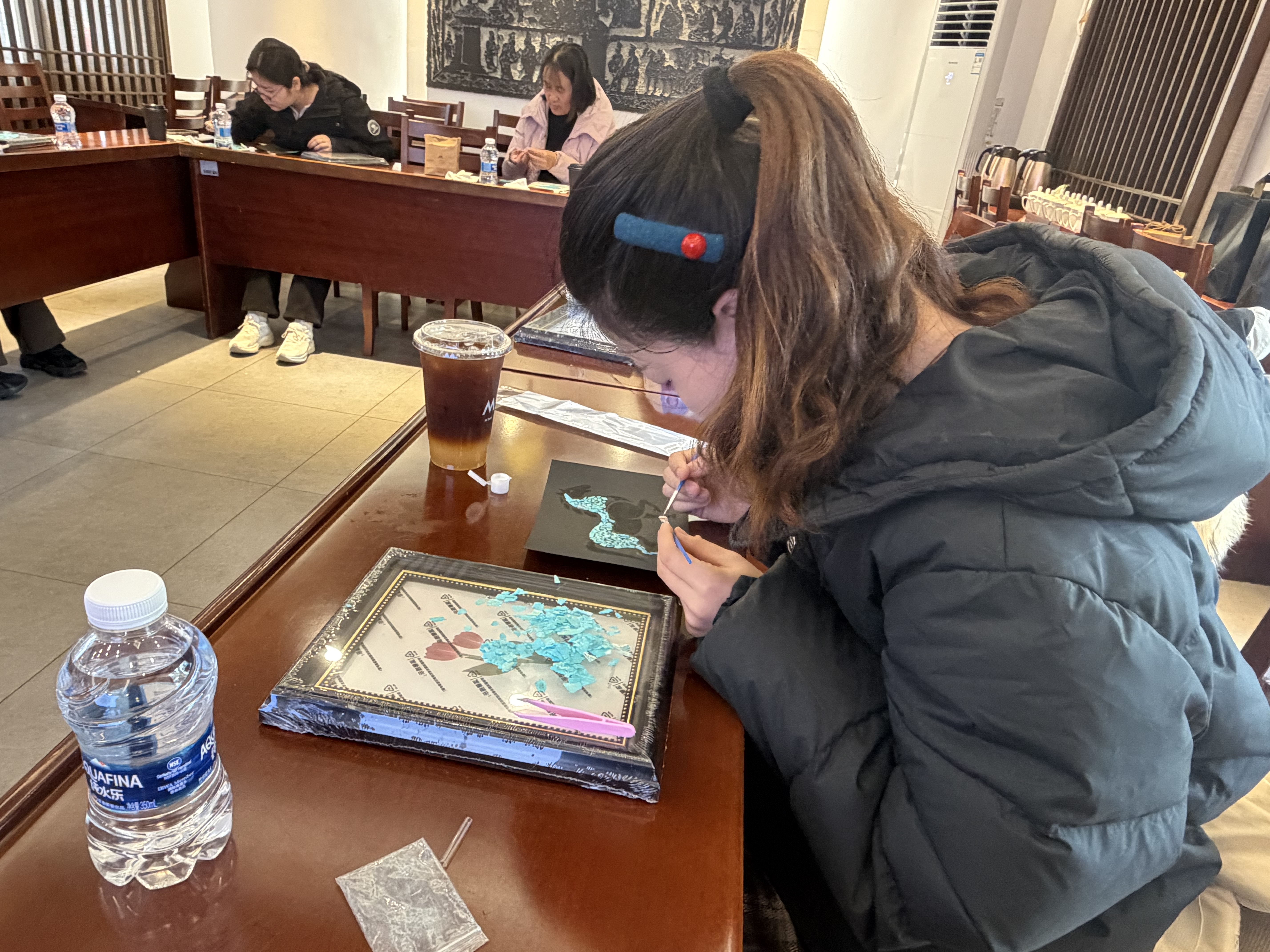 活动现场,非遗老师细致讲解螺钿工艺的历史渊源、选材打磨与拼贴技法,带领大家以贝为墨、以板为纸,在指尖流转中感受千年技艺的流光溢彩。来自市文物考古研究所的专家长期深耕田野考古、文物修复与历史研究,以专业守护文化根脉;在手工创作中,她们将考古工作的严谨细致融入拼贴,一件件精巧雅致的螺钿作品次第呈现,既展现非遗之美,也映照出考古女性的匠心与柔情。