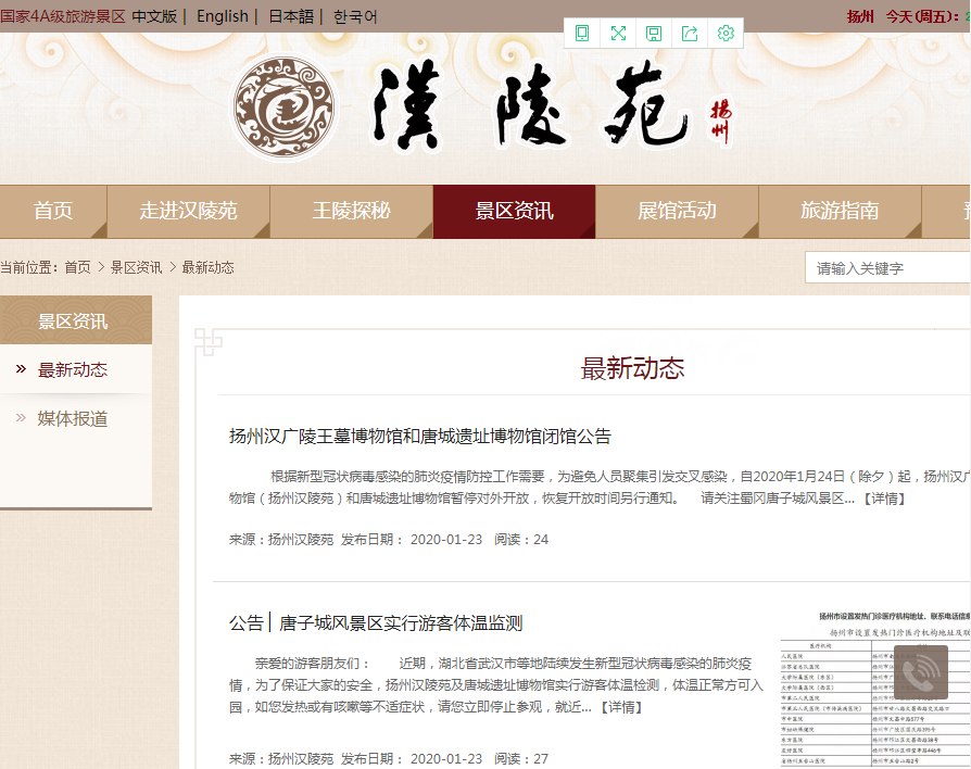 在景区管委会召开专门会议传达省、市疫情防控工作会议精神和部署相关工作安排后,唐子城管理处立即召开会议,迅速完成工作人员(包括物业人员)及近亲家属的排查工作,并按照要求,于1月24日关闭了所属三个博物馆(纪念馆);2月1日,为了最大限度地避免人流聚集带来的感染风险,封闭了汉唐文化广场(风筝广场)。