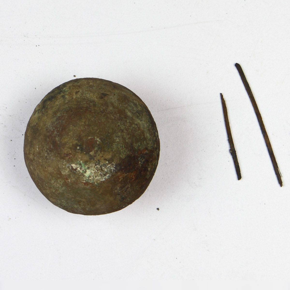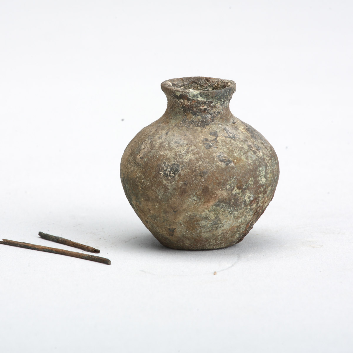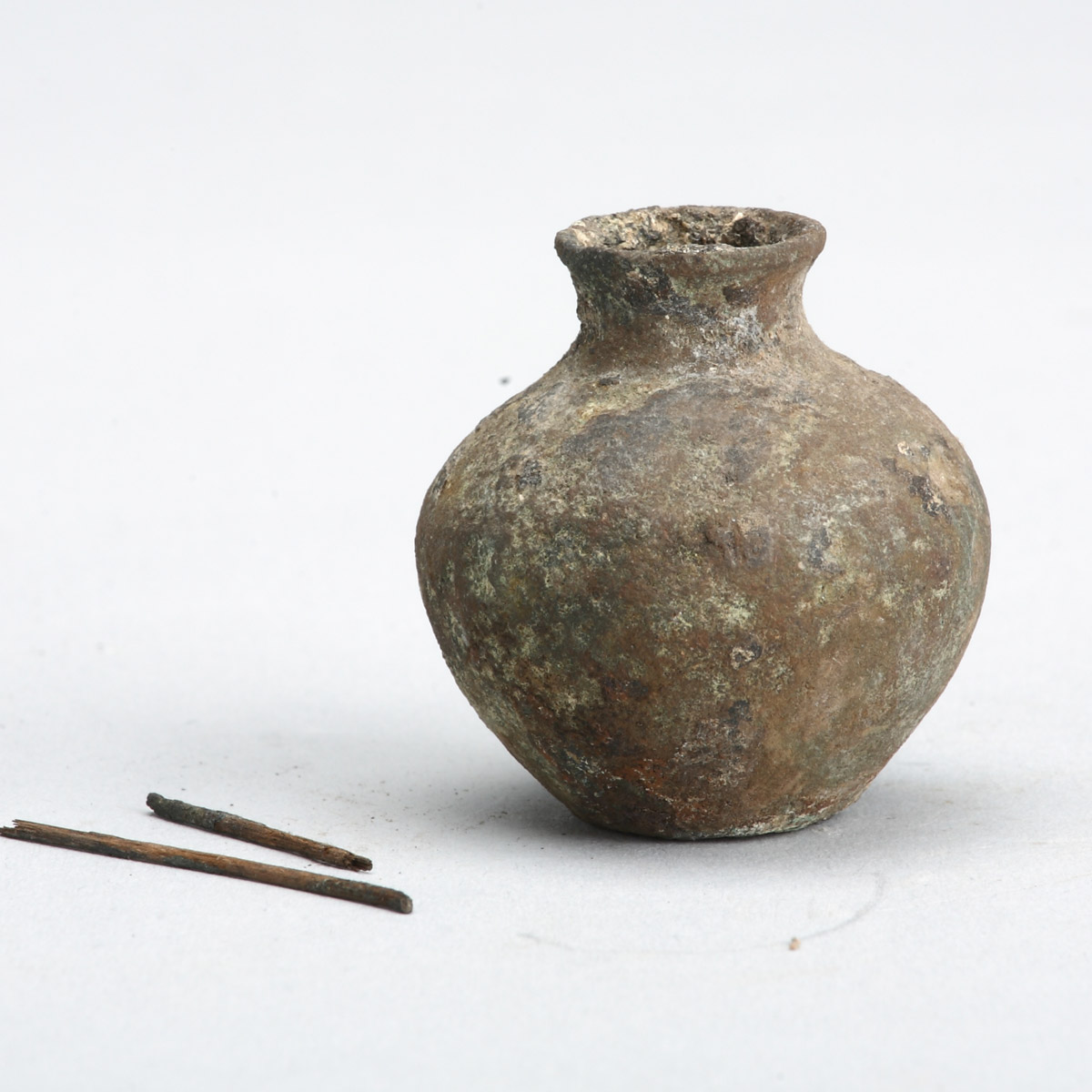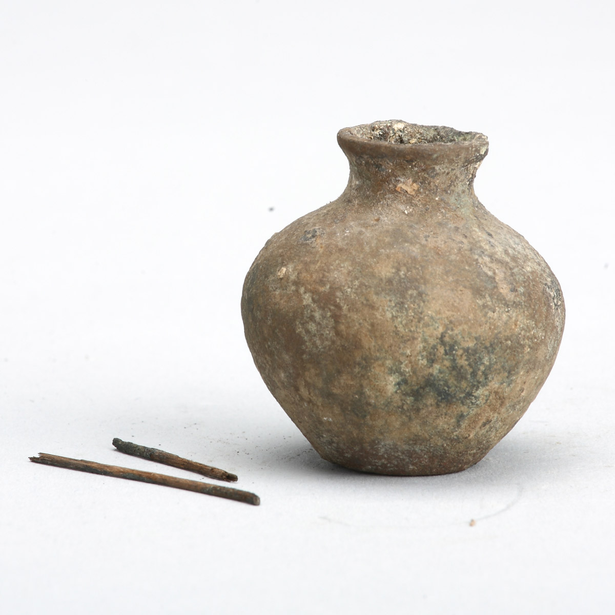 造型小巧,内存投矢两根,矢长4cm,投矢的质地为竹,投壶造型为罐式,素面无纹,已锈蚀,口部略残,保存基本完好。