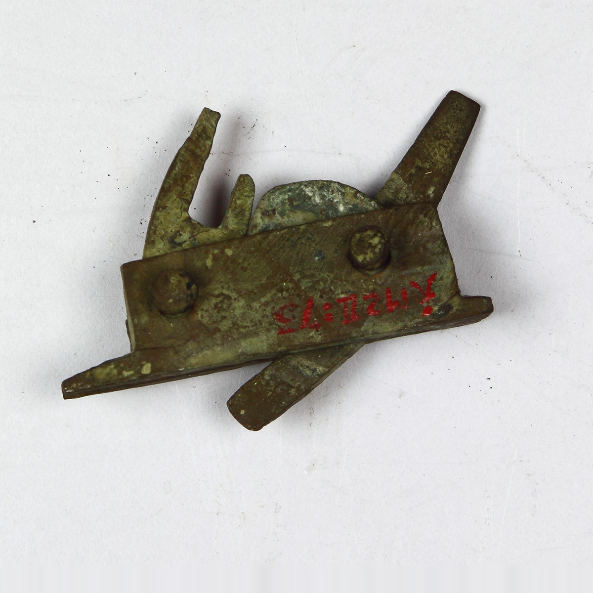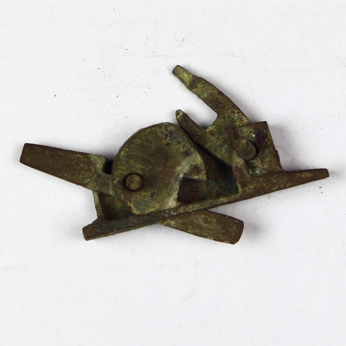 该弩机机芯部位的零件整个造型灵巧,由铜骨架、扳机、扳手、扣件,以及两根铆钉组合而成,保存较为完好。