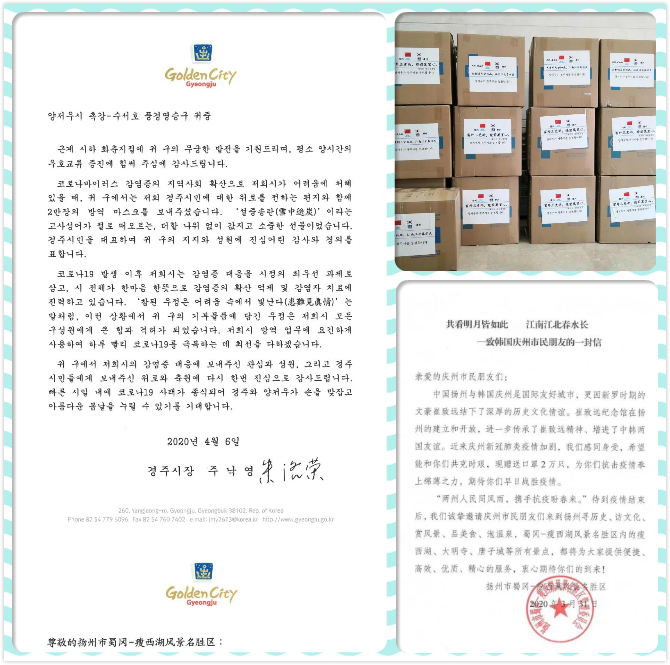 今年年初,新冠肺炎疫情爆发后,扬州崔致远纪念馆和庆州崔氏中央宗亲会一直保持密切的联系,多次交流情况、互致问候;3月底,蜀冈-瘦西湖风景名胜区管委会向庆州市民捐赠了两万只口罩,庆州市市长朱洛荣先生专门致信景区管委会表示“衷心感谢和崇高敬意”。