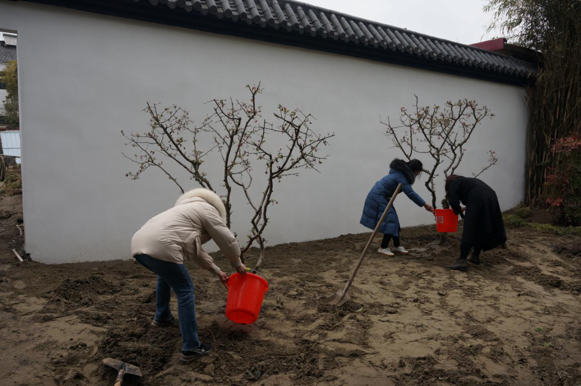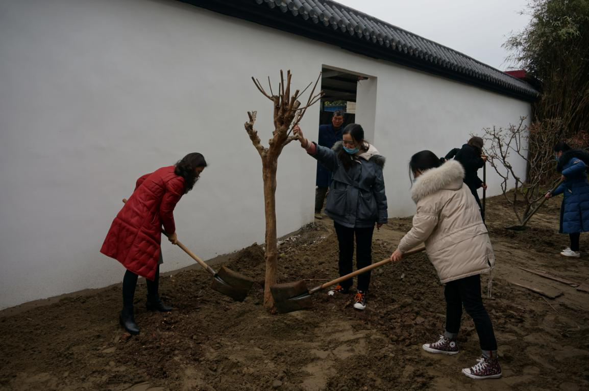 活动中,管理处职工在堡城村花木园艺合作社技工的指导下,一起动手,互相配合,共同完成了挖坑、埋苗、施肥、填土、浇水等步骤,一棵棵垂丝海棠、红枫、茶树顺利栽种完成,为景区增添了一片新绿。