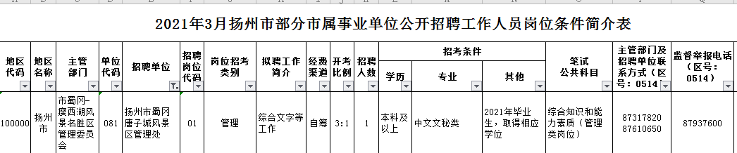 可通过以下网站查询《2021年3月扬州市部分市属事业单位公开招聘工作人员岗位条件简介表》: