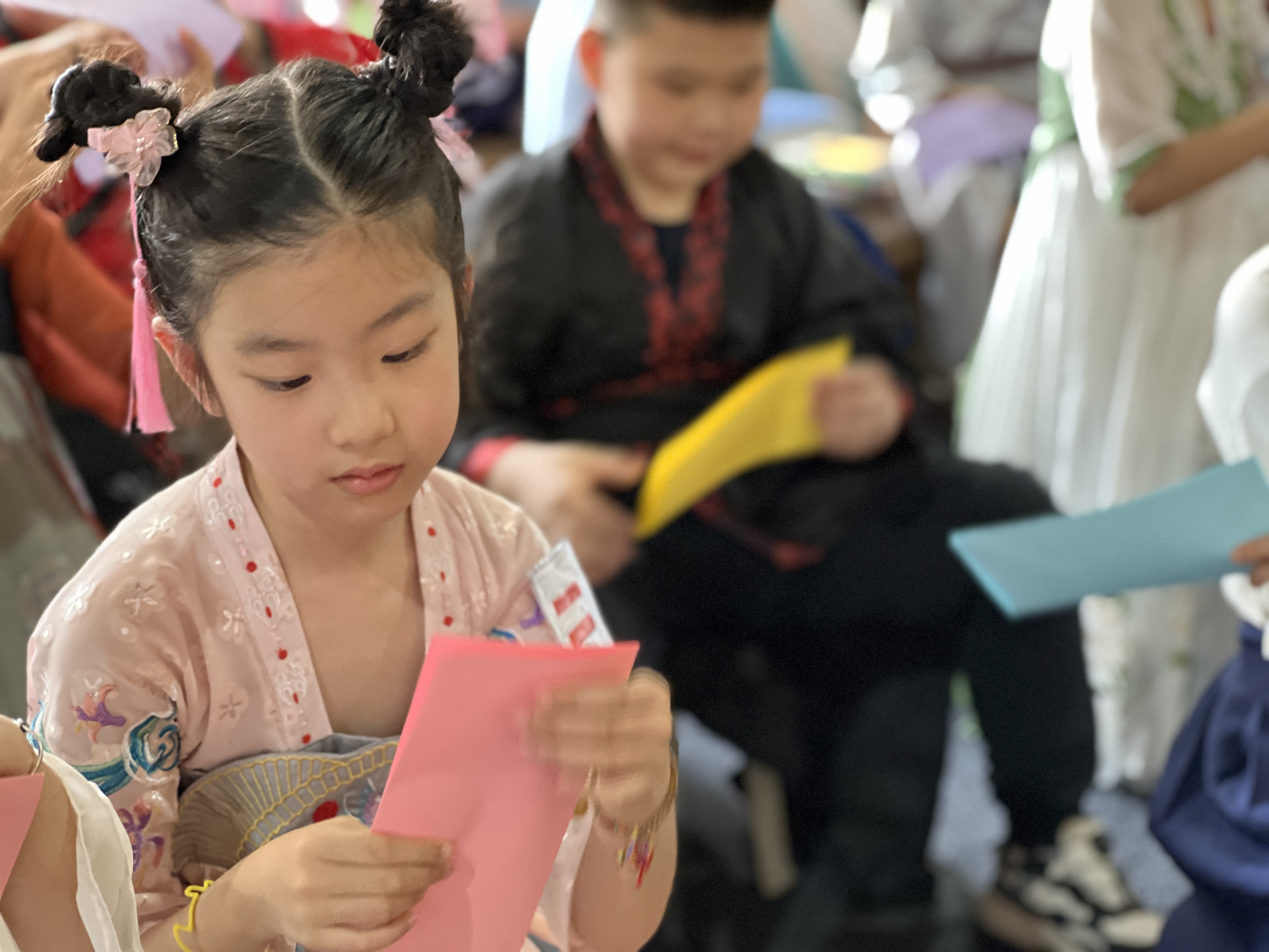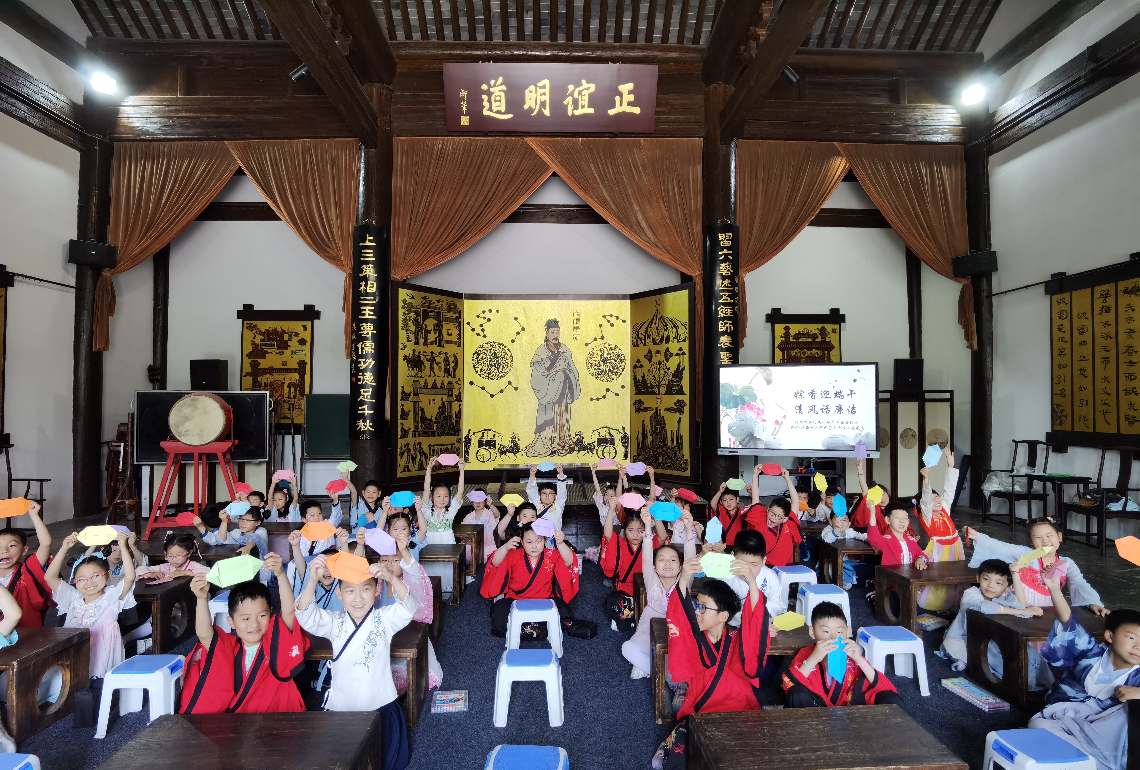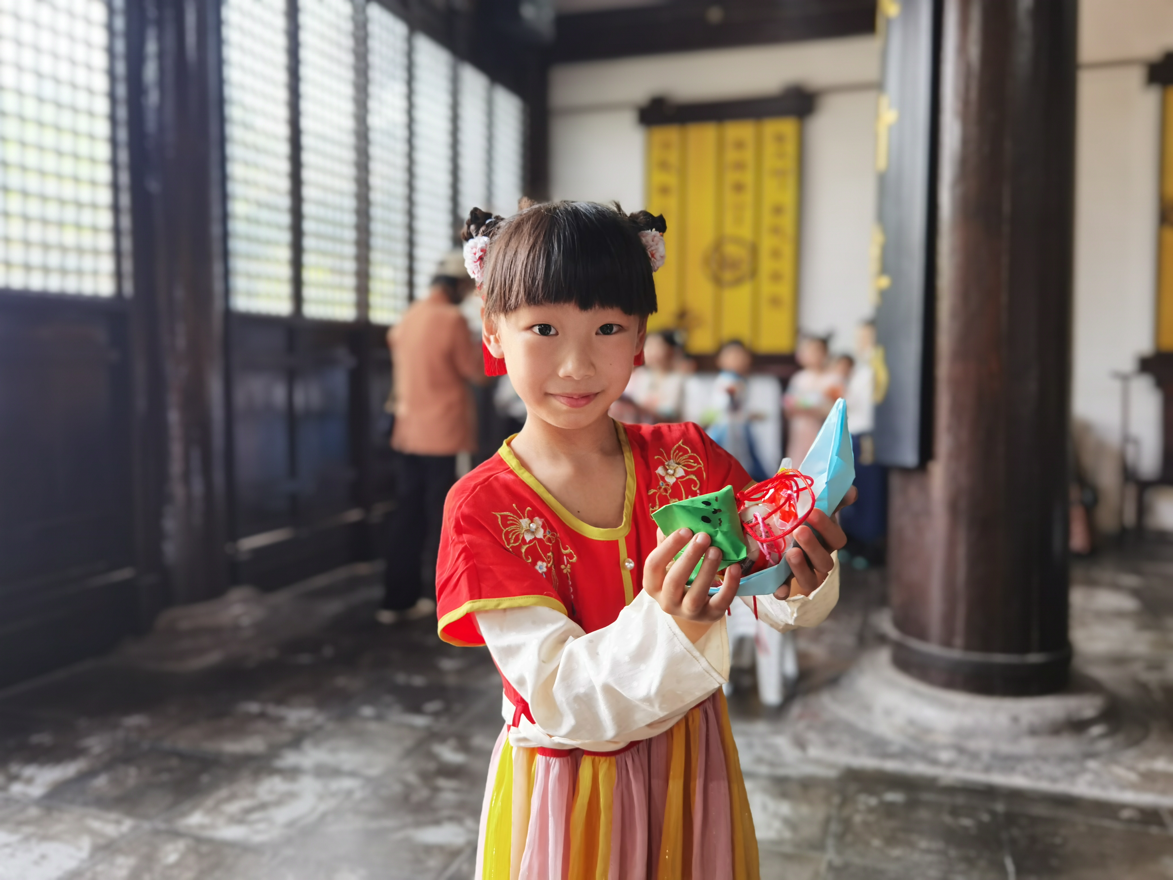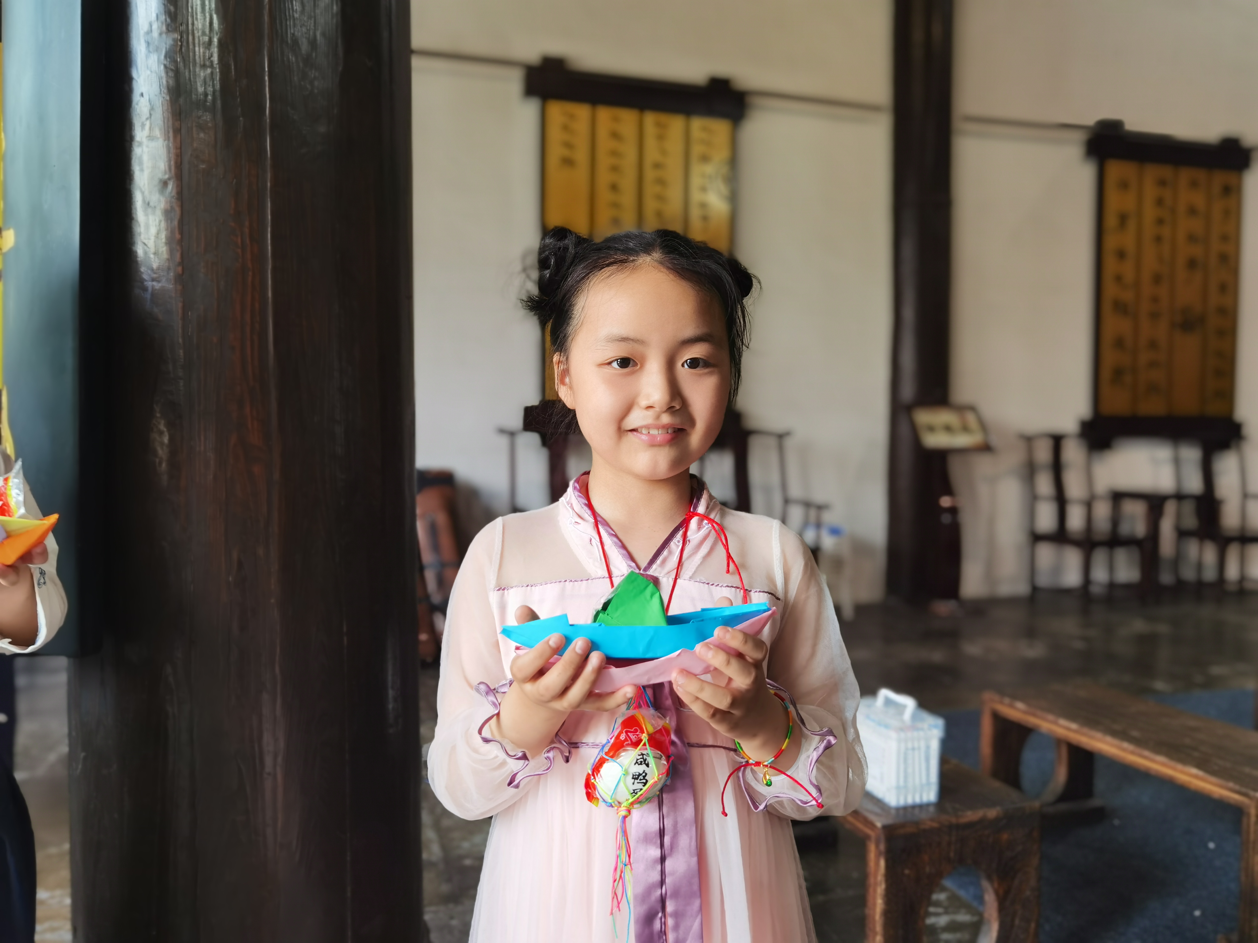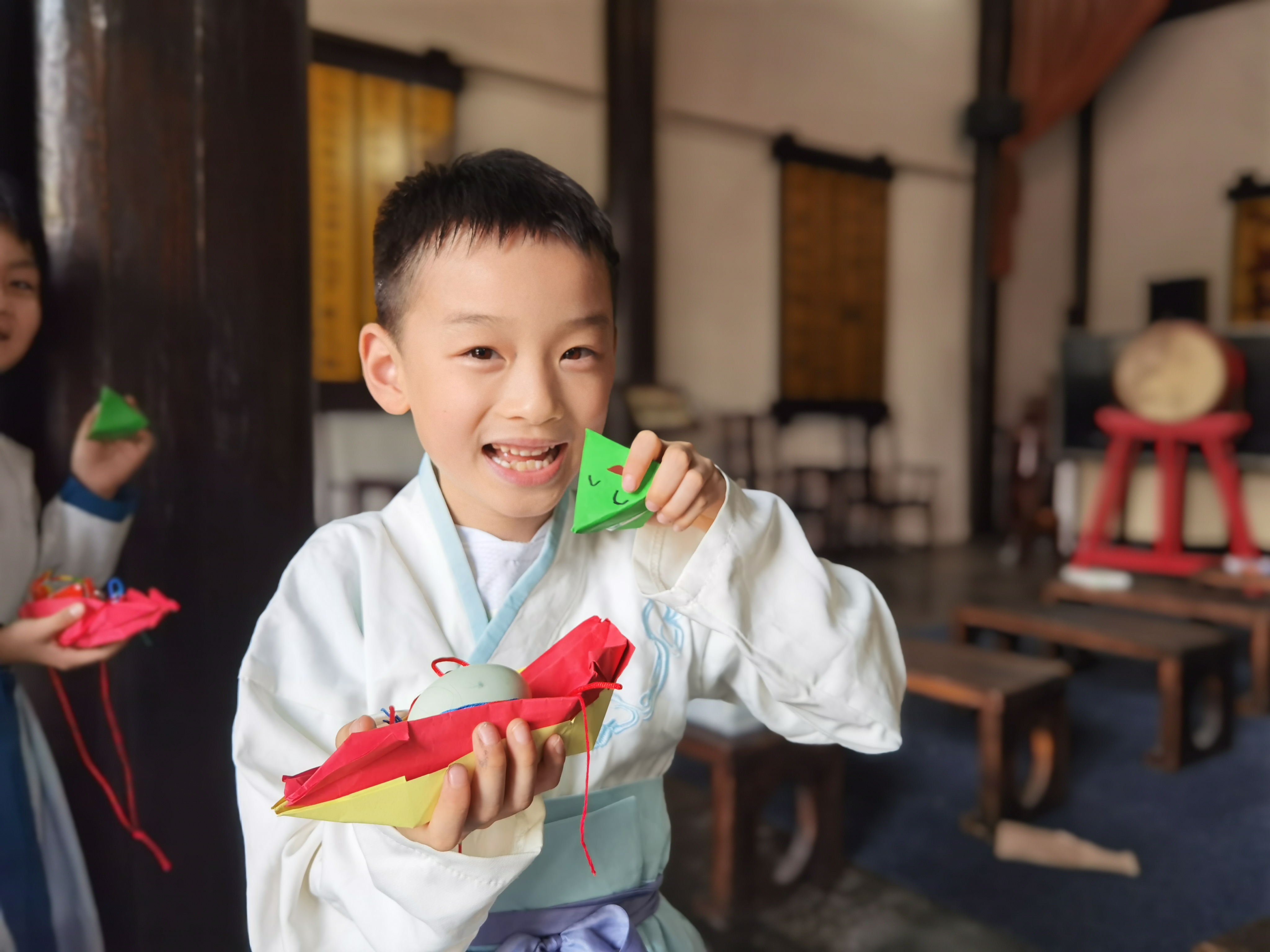 端午节对于中国人来说,不仅是为了纪念伟大的爱国诗人屈原,也寄托了人们迎祥纳福、辟邪除灾等众多愿望。书院的学生们在景区老师的指导下将龙舟和粽子等端午节的节日符号用彩纸折出。用五色丝线,编织成盛放鸭蛋的篓子,挂在胸前,手腕戴上多彩的五彩绳,辟邪祈福、保佑平安。