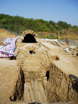 这座砖室墓位于我市新公布的甘泉—杨庙战国至五代墓葬埋藏区范围。考古人员查阅了相关资料,并走访附近老百姓,得知砖室墓葬原葬在一座高山之上,据此附近出土的石质墓志记载,明代称此为“白塔山”。山头上的土方已为现代砖瓦厂制砖坯所取用,墓葬上原有封土亦荡然无存,致使砖室暴露于现地表。这座砖室墓由墓道、甬道和主墓室三部分组成。坑口的东南面,为斜坡形墓道。墓门为双券顶结构,外层券顶略凸出。