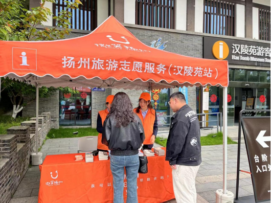 园区内,除了有汉服小姐姐服务,还有橙色、红色志愿者服务,每日9点至16点,在游客中心及景区内部负责游客咨询、发放宣传册、分流指路、维持游览秩序等志愿服务工作。另外景区职工也在园区内进行志愿服务,保证五·一节假日期间景区内部游客有序游览,保障安全舒适的游览环境,提供热情周到的服务。