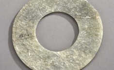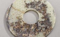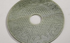 青玉,由内向外有三圈刻纹,内圈为榖纹,中间绳纹,边饰为变体蟠螭纹,璧身裂纹5道、断裂一道、边角残缺一角,均已修复。 【详情】