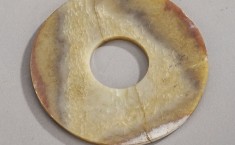 素面无纹,中部有一道断裂已修复,边缺一角,玉质一般,玉色泛黄,有冰裂纹多道。 【详情】