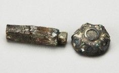 镶嵌绿松石6粒,缺饰件6粒,通体为铜鎏金,中间枘头有一圈凸纹,枘头背面残缺,枘柄为木质,已脱水。 【详情】